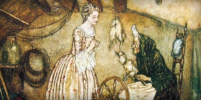 The King, who naturally wished to protect his child from this misfortune, issued a decree commanding that every spindle in the kingdom should be burnt. Meanwhile, all the gifts of the wise women were fulfilled, and the maiden became so beautiful, gentle, virtuous, and clever, that everyone who saw her fell in love with her. It happened on the day when she was just fifteen years old that the Queen and the King were not at home, and so she was left alone in the castle. The maiden looked about in every place, going through all the rooms and chambers just as she pleased until she came at last to an old tower. Up the narrow winding staircase, she tripped until she arrived at a door, in the lock of which was a rusty key. This she turned, and the door sprang open, and there in the little room sat an old woman with a spindle, spinning flax. "Good-day, my good old lady," said the Princess, "what are you doing here?"